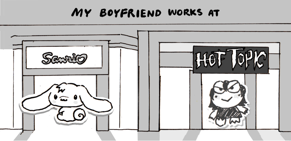 Shiro works at the Sanrio store. Keith works at the Hot Topic next door. Both of them have crushes on eachother!
